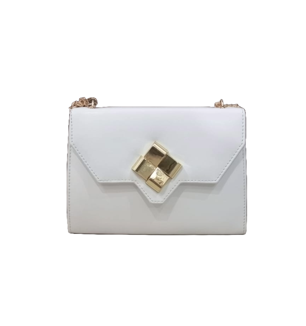 A chic white crossbody bag designed to elevate your everyday and evening style with its sleek finish and elegant golden chain.